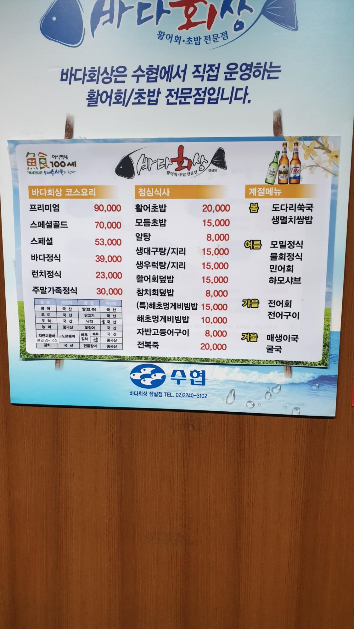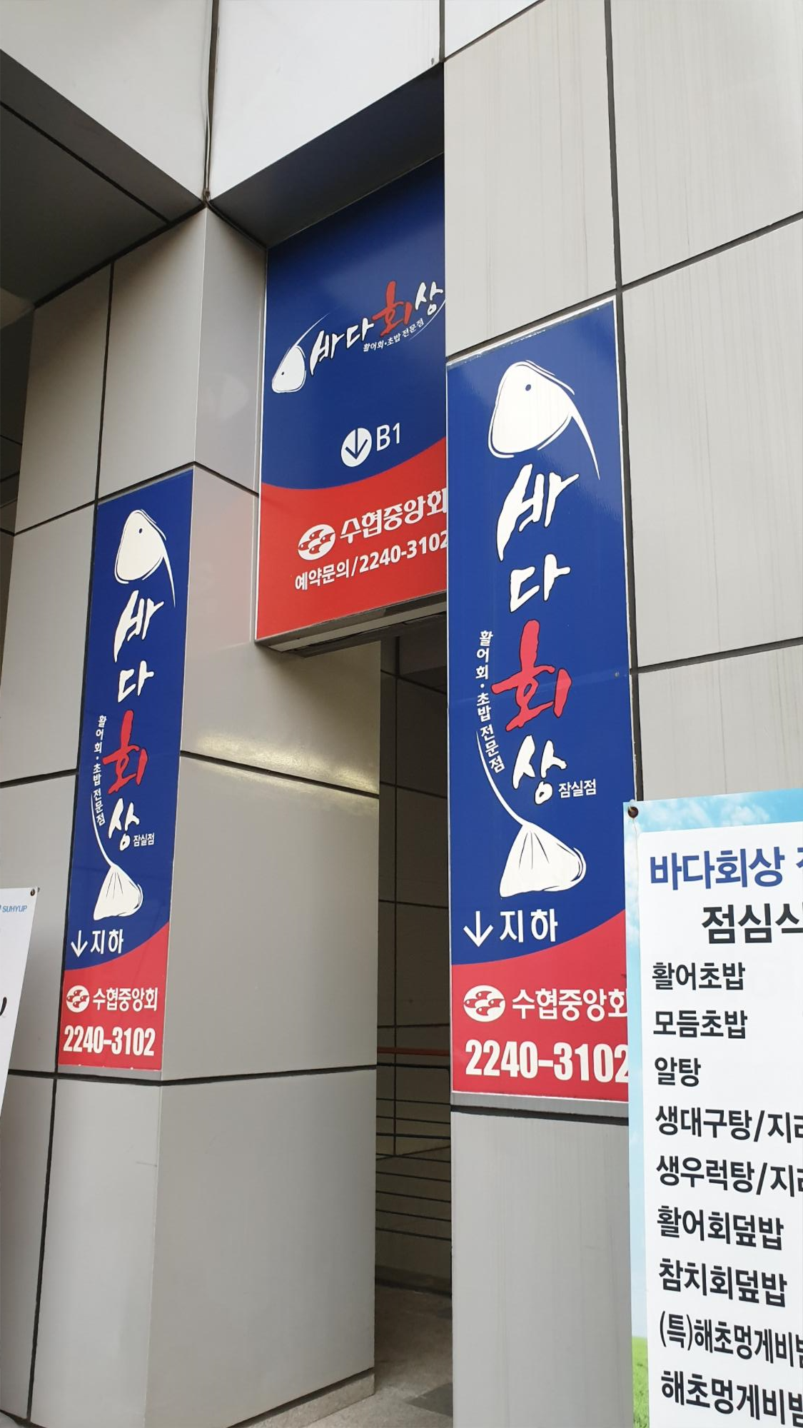 수협에서 운영하는 바다회상 잠실점. 넓고 방이 많아 모임, 회식하기 좋은 곳.