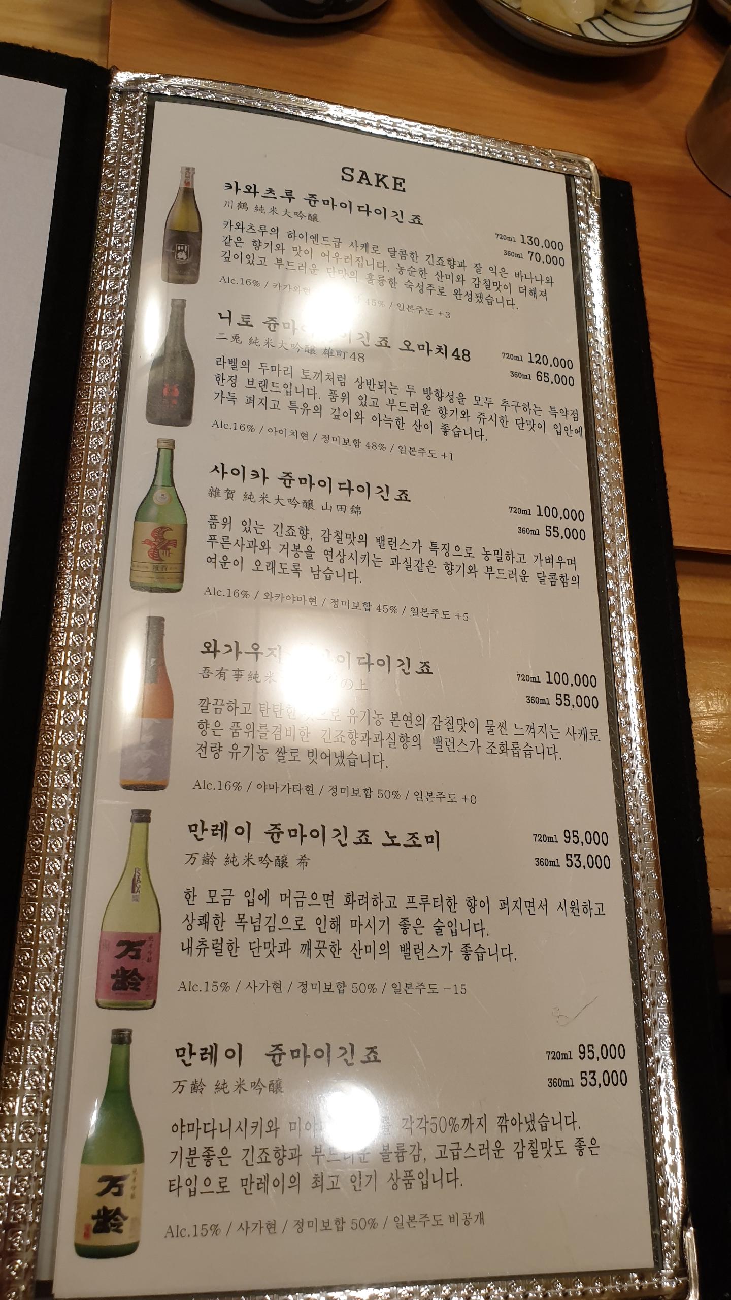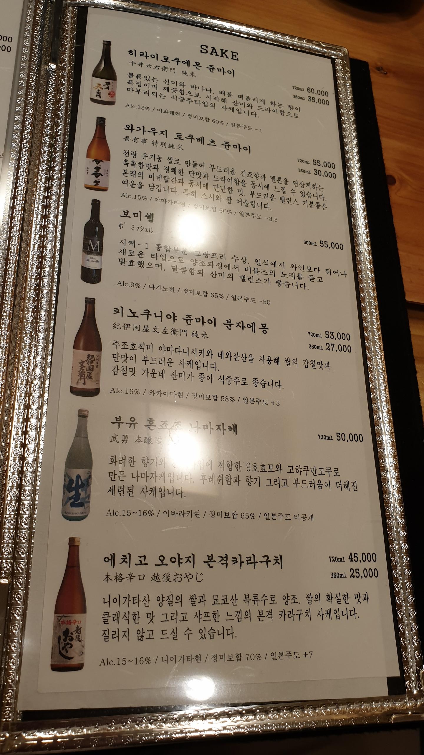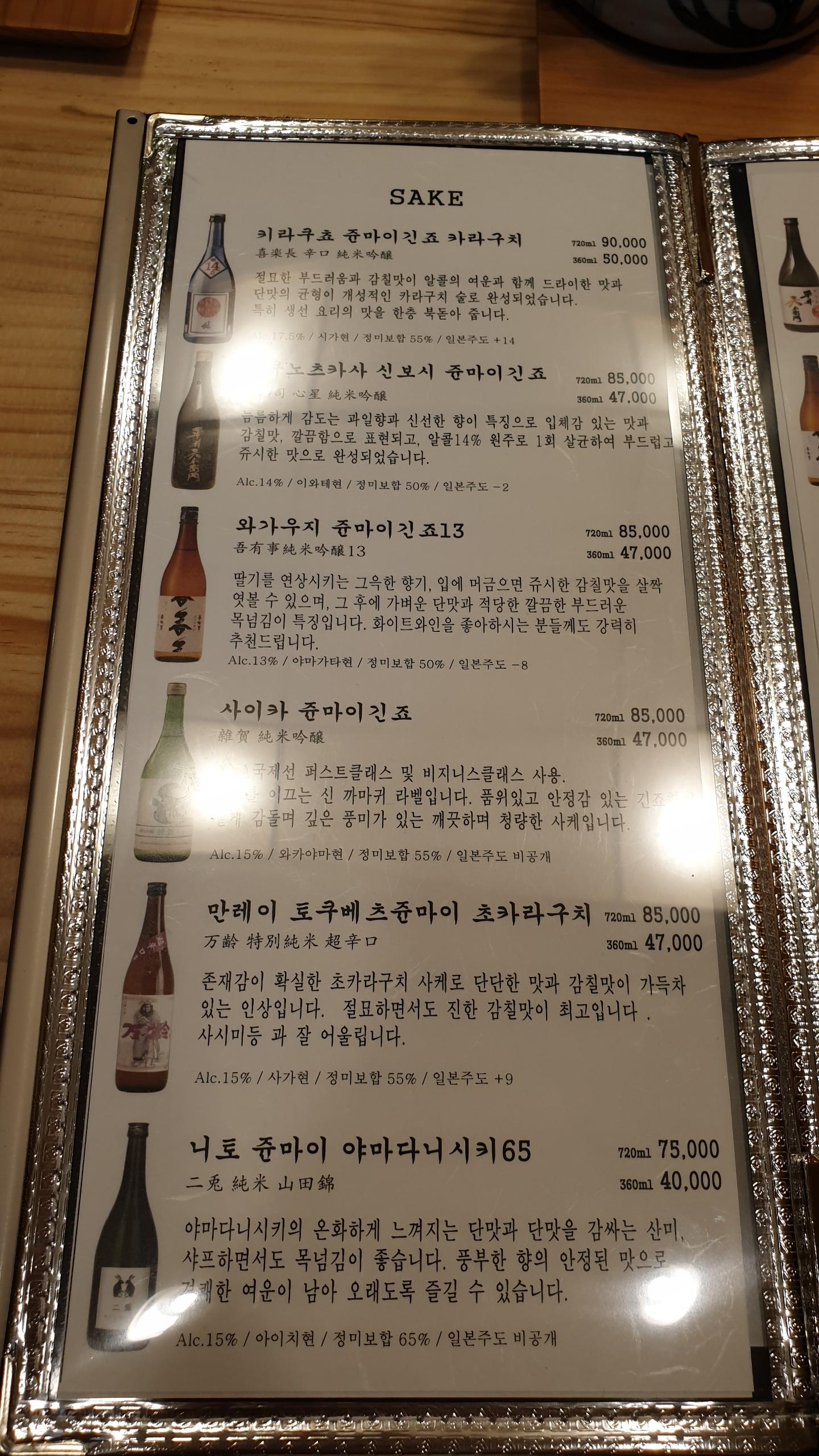 아래는 주류 메뉴. 사케 리스트.