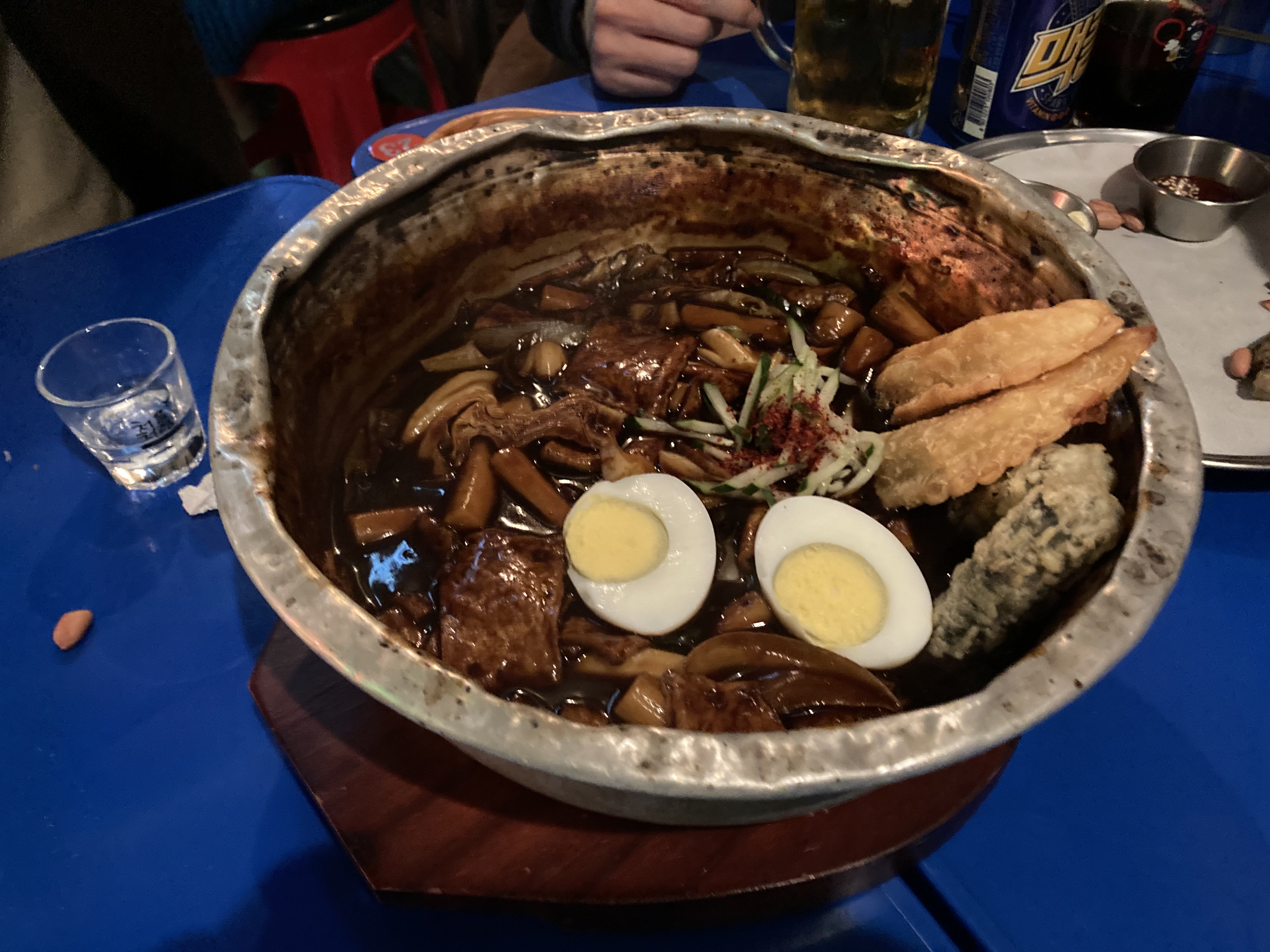 삶은계란, 오이, 고춧가루, 튀김만두, 김말이.