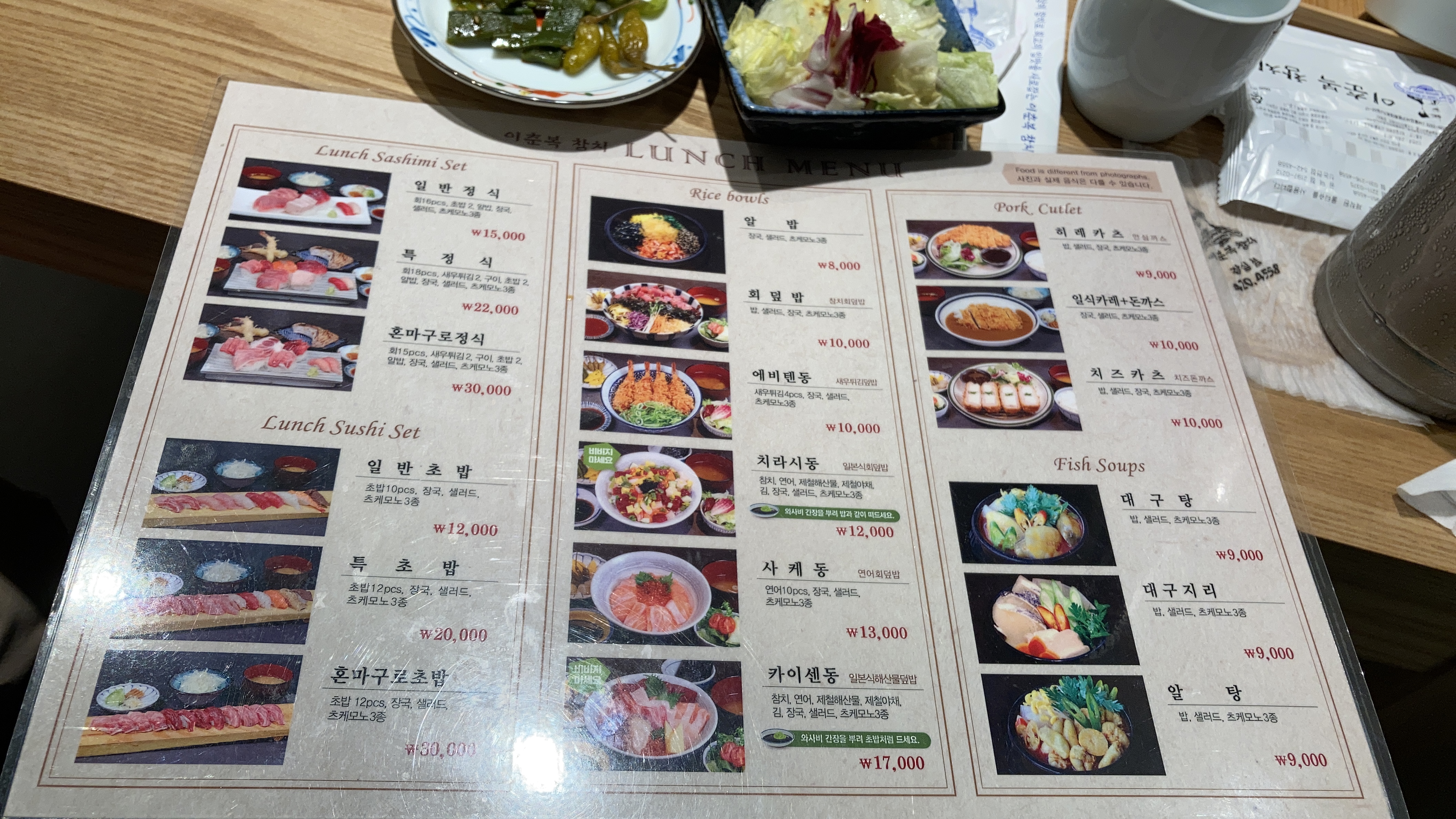 카이센동 - 해산물덮밥. 참치, 연어, 제철해산물, 제철야채, 김, 장국, 샐러드, 츠케모노 3종.